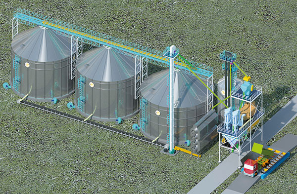 Технологическая схема для фермерского элеватора должна обязательно включать, но не ограничиваться: приемка зерна -» очистка -» накопительный бункер -» зерносушилка -» силоса от 2 до 5 шт.